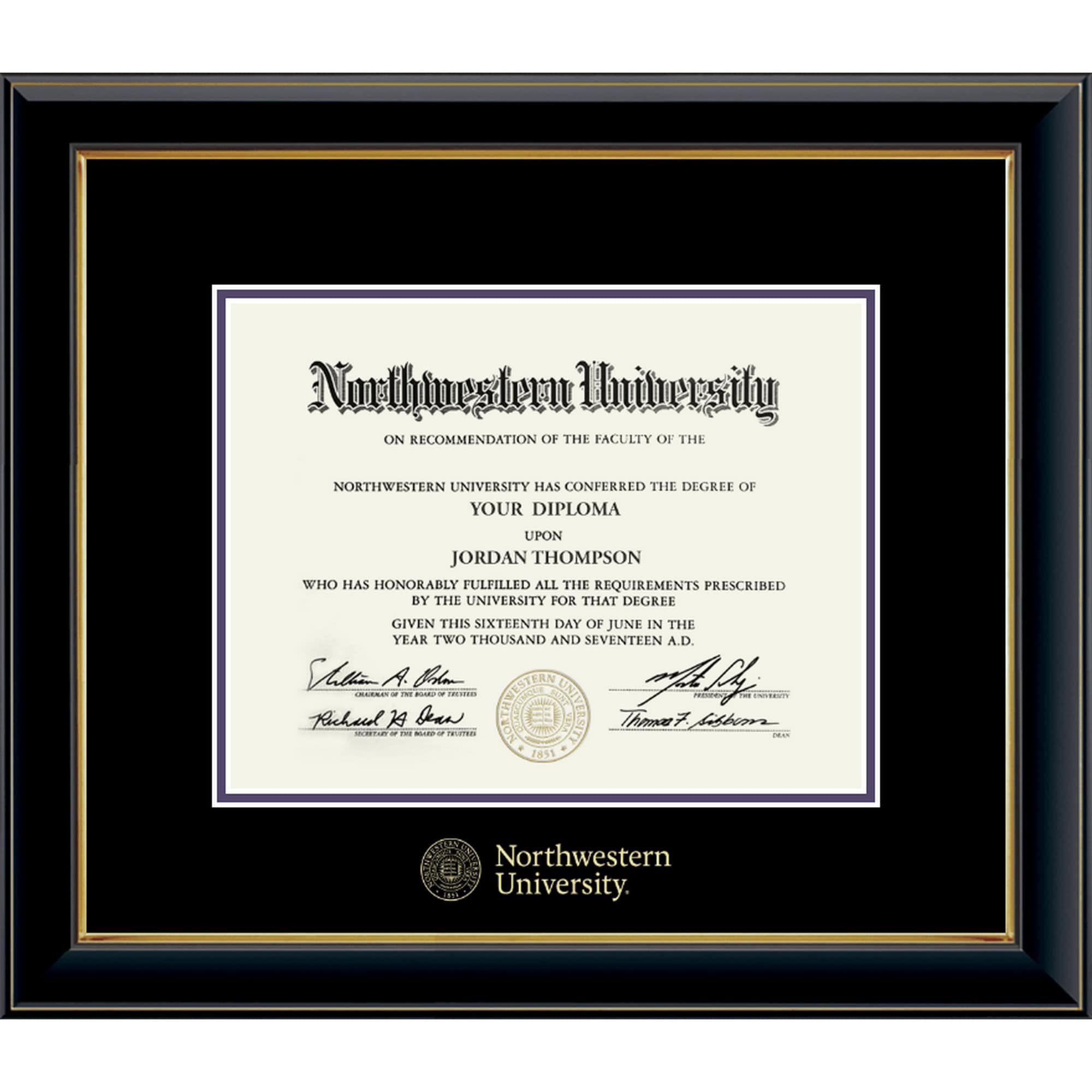 Northwestern University Wildcats Onyx Double Matted Black Diploma Frame With Gold Accent & Gold Embossed Northwestern University Seal Design With Main Matt In Black